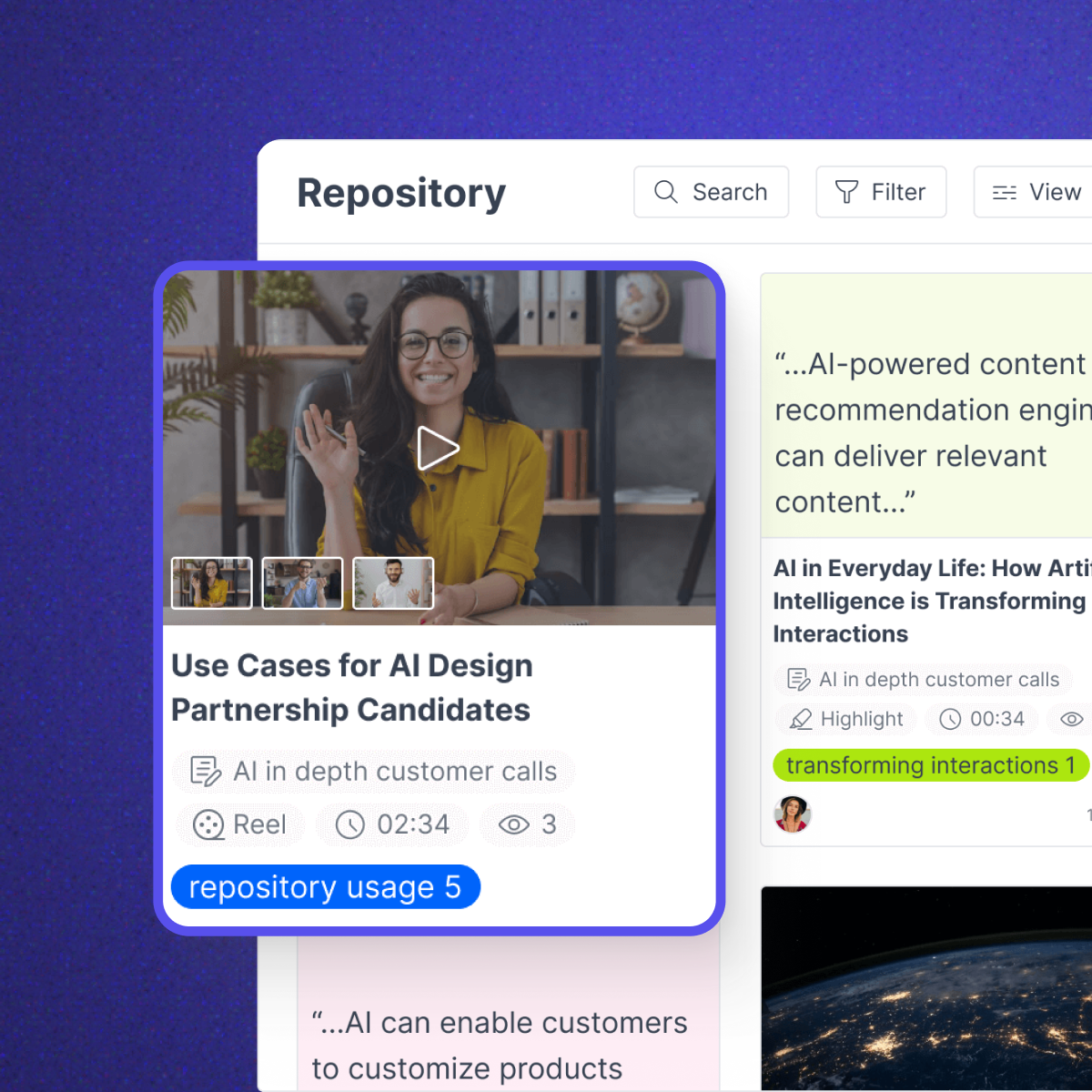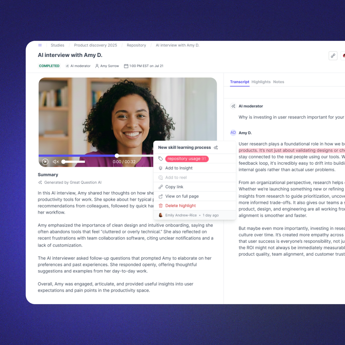 “With Ask AI, we can now get an initial analysis of hours of interviews in minutes. This feature helps our teams move faster when understanding user needs and problems.”
