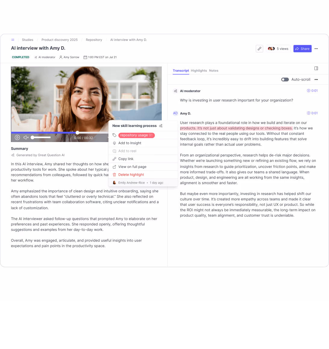 "With Ask AI, we can now get an initial analysis of hours of interviews in minutes. This feature helps us move faster when understanding user needs and problems and creating features to address them."