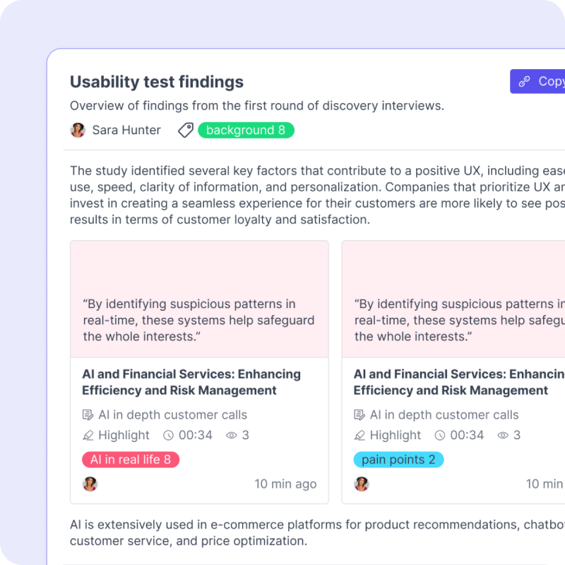 AI delivers transcripts, summaries, and themes in minutes.