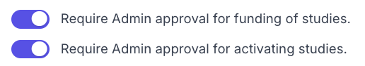 - Require Admin approval before funding studies or Require Admin approval before activating studies.
