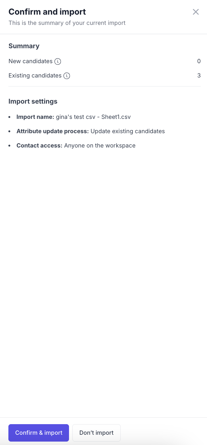 Duplicate candidates skipped | Import settings are set to skip duplicates. | Choose Update existing candidates during import to overwrite existing records instead. |