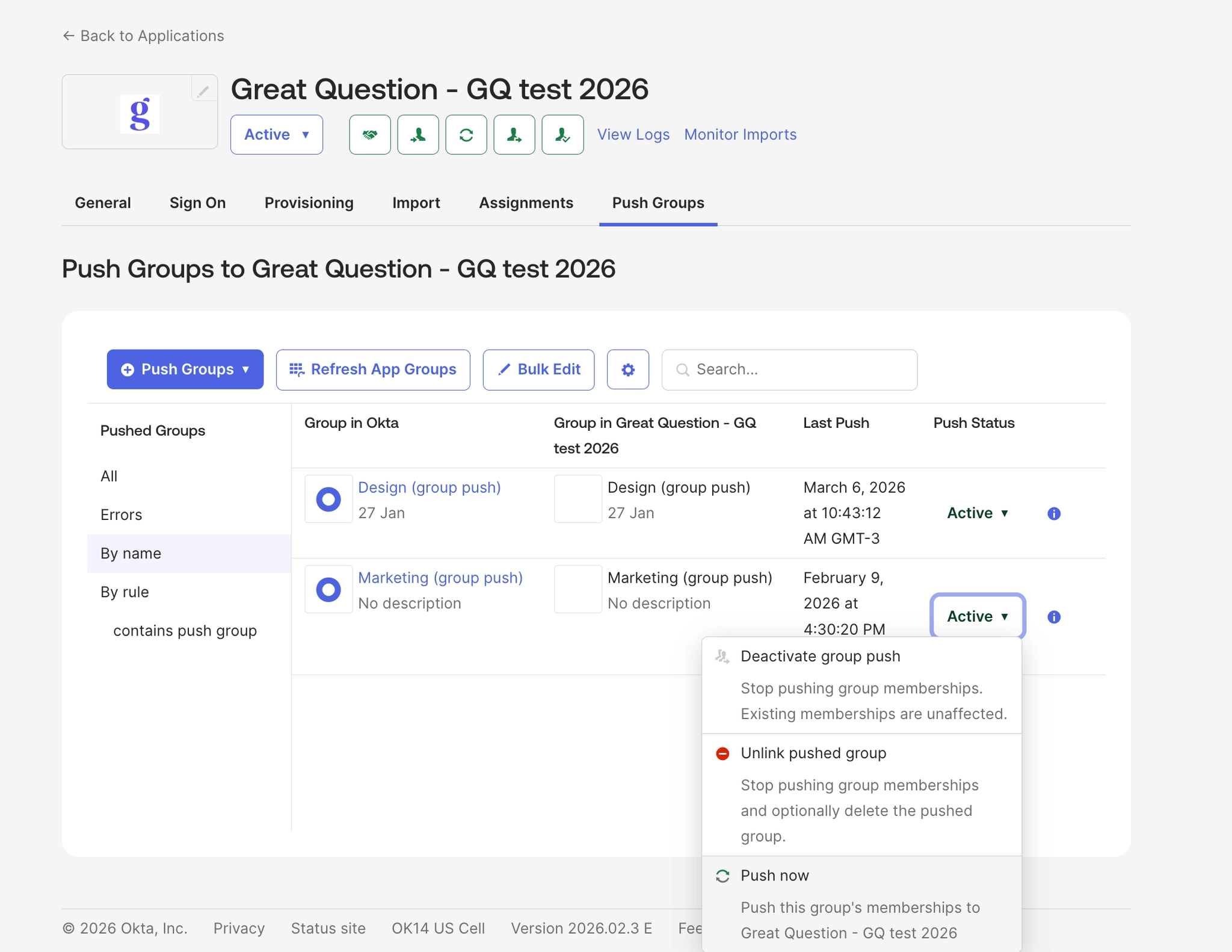 Group membership removal in Okta is not reflected in Great Question | Okta may not send the membership removal event depending on how users are assigned to the app | Trigger a manual sync from Applications → Push Groups → [select group] → Push Now in Okta. |