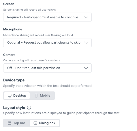 - Researchers no longer have to choose between completion rates and data quality. Camera, microphone, and screen recording permissions can now be set to Optional.