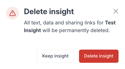 Deleted Insight still visible in Repository | The page is cached or the workspace didn’t refresh. | Refresh your browser or clear filters. The deletion will take effect once the Repository reloads. |