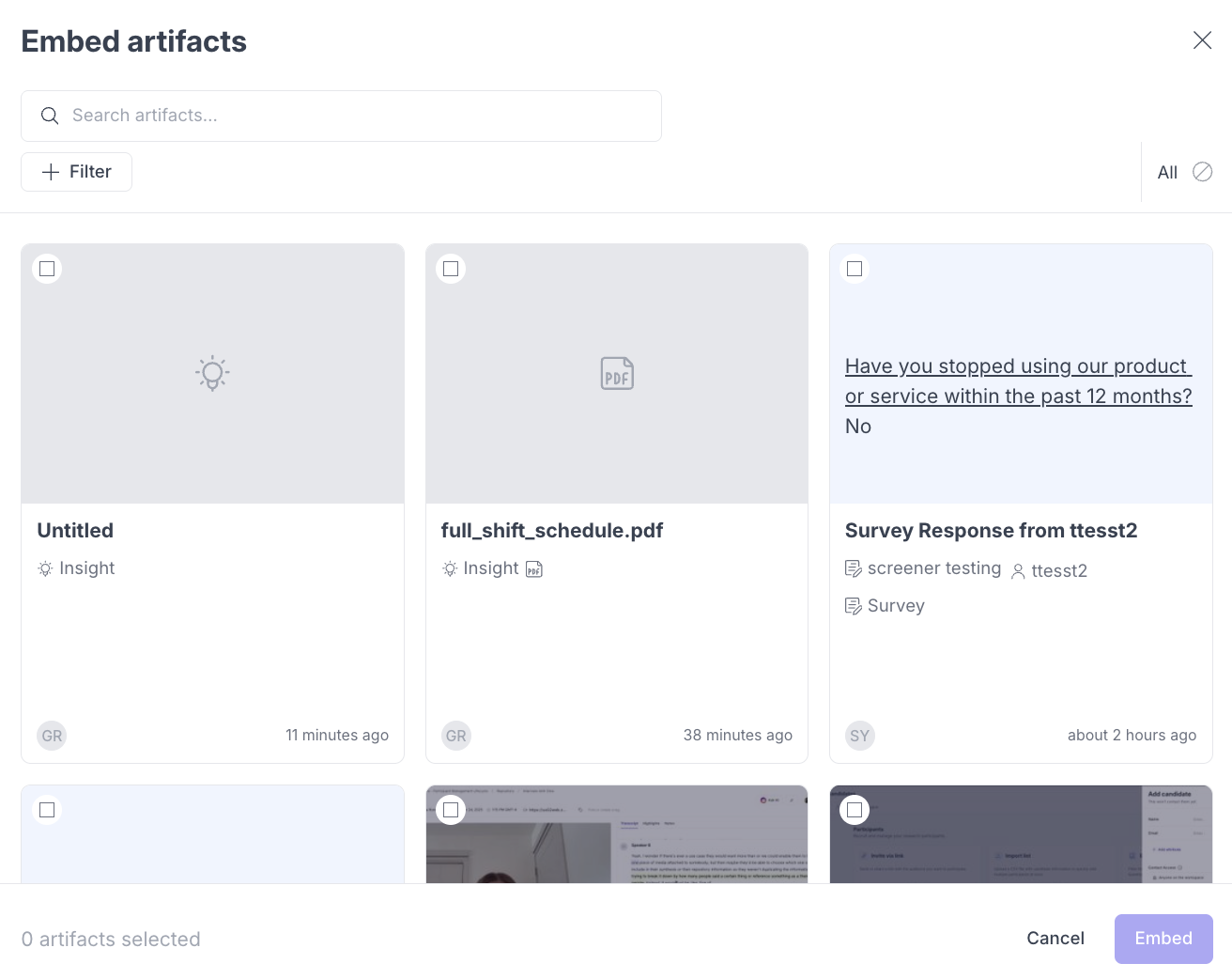- After clicking Embed, you’ll see a list of artifacts and insights you can add.