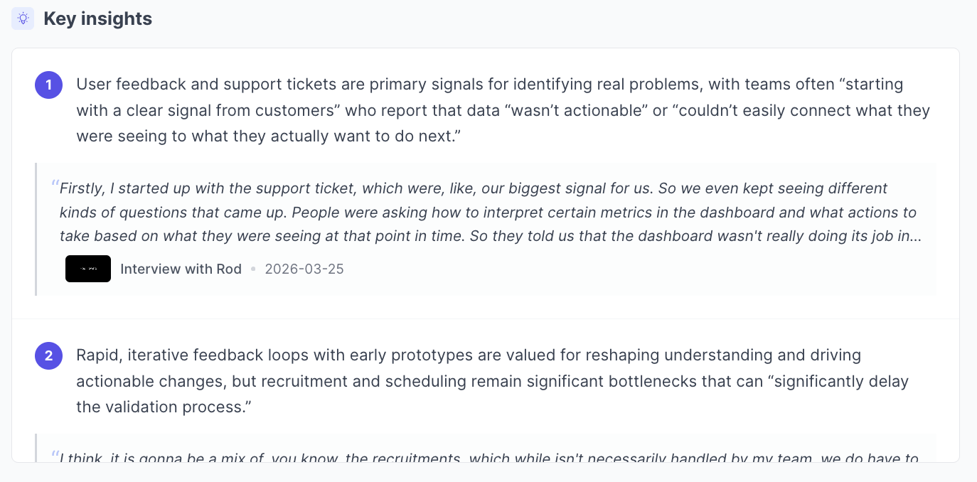 Key insights are the most significant takeaways from the study, numbered and ordered by importance. Each insight includes a supporting quote from a specific interview, attributed to the participant with the interview date.