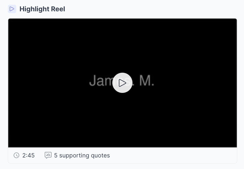 Watch the highlights. An auto-generated highlight reel stitches together the key quotes from your session recordings into a single video compilation, complete with chapter cards for scrubbing to individual moments.