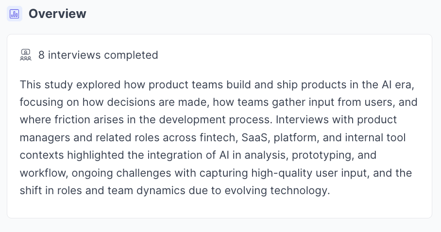 AI Synthesis in Great Question is where you go to understand what a study revealed. When a study reaches three or more completed interviews, the AI Synthesis tab automatically generates a structured summary of your findings — including an overview, key insights, and major themes with supporting quotes. No manual tagging or organizing required.