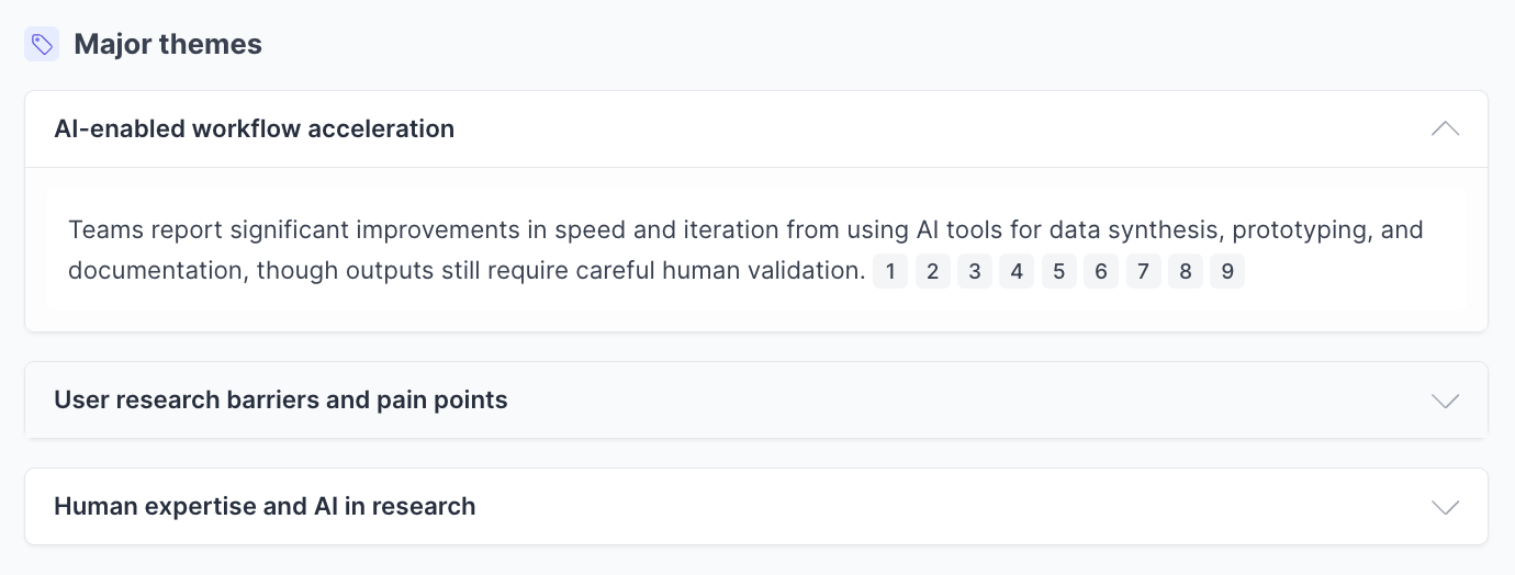 Themes are the core patterns that emerged across your interviews. Each theme is displayed as an expandable section with sub-items that include inline citation badges. These badges represent the number of supporting quotes behind each sub-item.