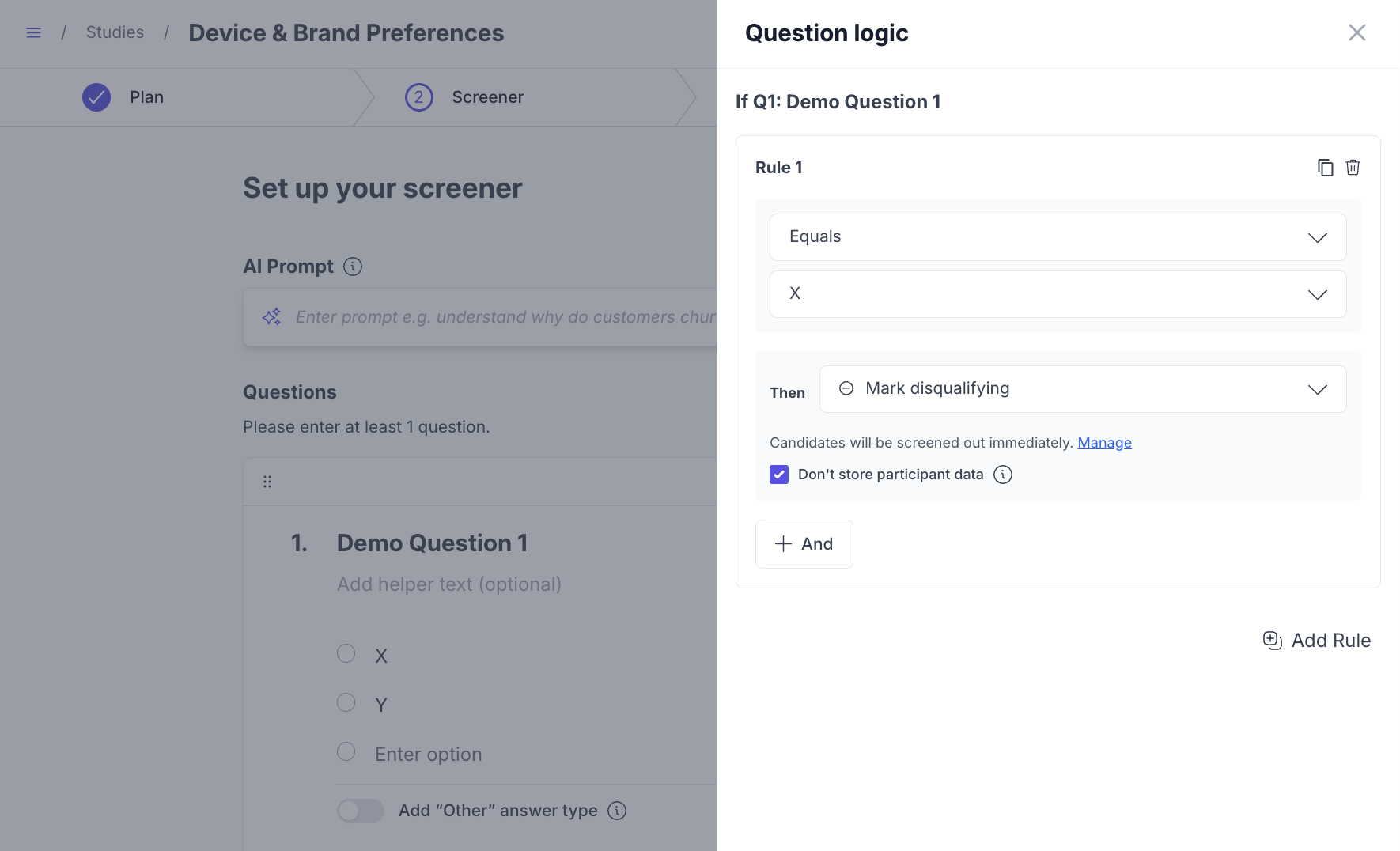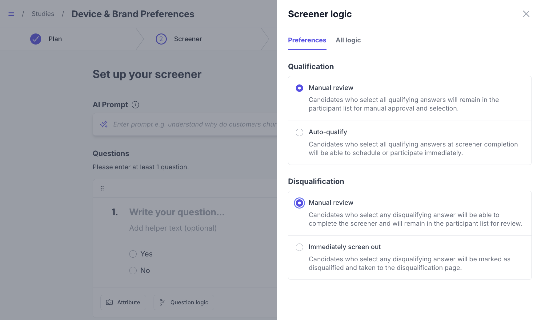 Screeners are short questionnaires you add to a study to help qualify or disqualify participants before they join. They ensure you execute studies with people who meet your criteria — saving time and improving research quality.